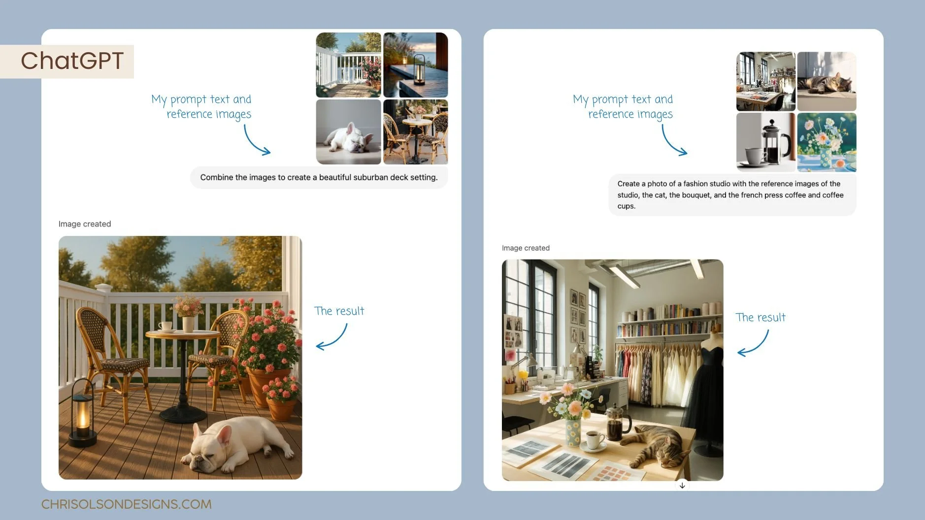 Side-by-side example showing how ChatGPT combines reference images and a prompt to generate a cohesive concept image of a suburban deck and a fashion studio.