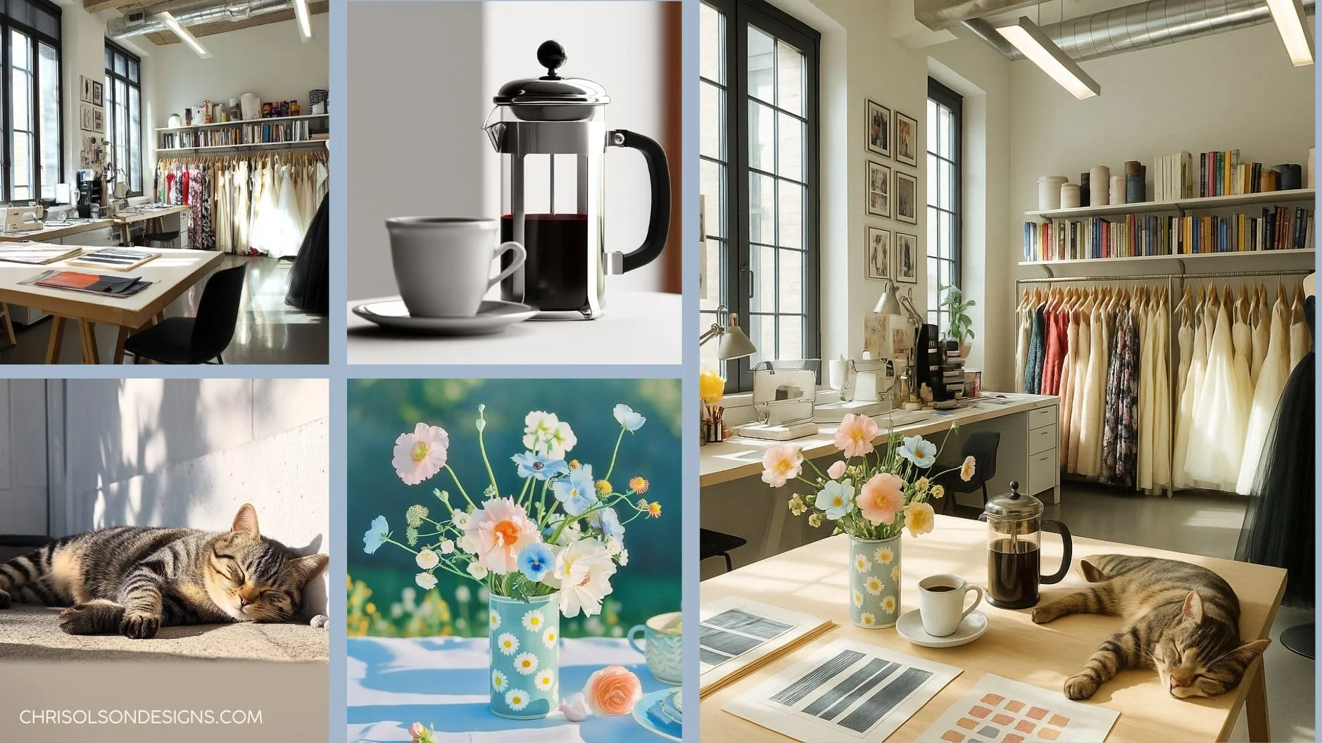 “Create a photo of a fashion studio with the reference images of the studio, the cat, the bouquet, and the French press coffee and coffee cups.”